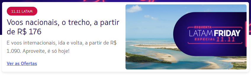 A LATAM está realizando nesta terça-feira (11) a promoção relâmpago 11.11! Na campanha, a companhia está oferecendo passagens aéreas nacionais a partir de R$ 153,36 o trecho e internacionais a partir de R$ 1.073,62 ida e volta.