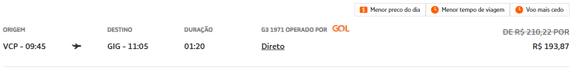De Campinas (VCP) para o Rio de Janeiro (GIG) a partir de R$ 193,87.
