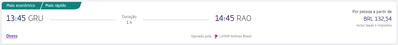 No exemplo abaixo, está o menor encontrado a partir de R$ 132 no trecho São Paulo (GRU) → Ribeirão Preto (RAO), em voo direto com cerca de 1 hora.