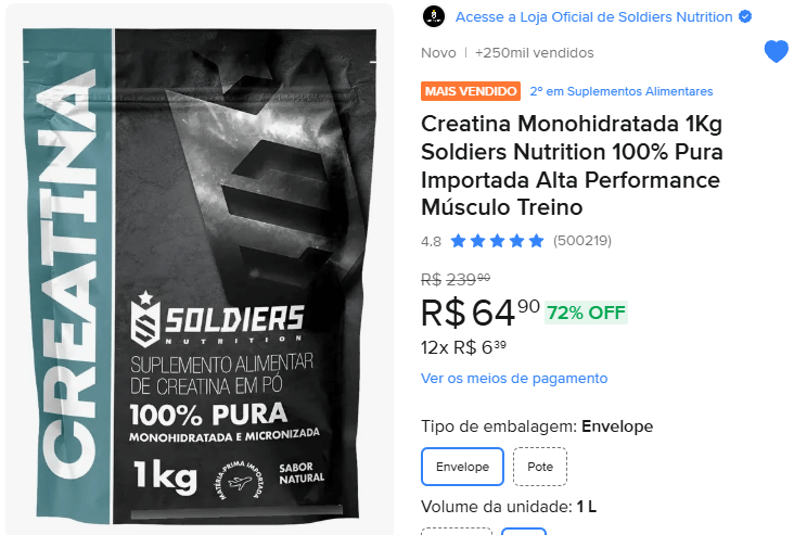 Creatina Monohidratada 1Kg Soldiers Nutrition 100% Pura Importada: de R$ 239 por R$ 64! E ainda tem frete grátis!