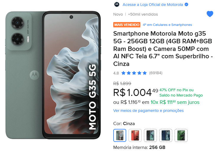 Smartphone Motorola Moto g35 5G – 256GB 12GB (4GB RAM+8GB Ram Boost) e Camera 50MP com AI NFC Tela 6.7″ com Superbrilho – Cinza: de R$ 1.899 por R$ 1.004 (47% de desconto!) também com frete grátis!