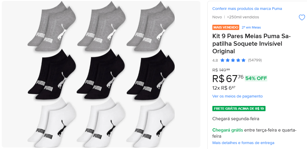 Kit 9 Pares Meias Puma Sapatilha Soquete Invisível Original: de R$ 149 por R$ 67 (54% desconto!) também com frete grátis!