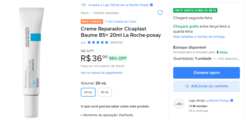 Creme Reparador Cicaplast Baume B5+ 20ml La Roche-posay: de R$ 57 por R$ 36 (36% de desconto!) + frete grátis!