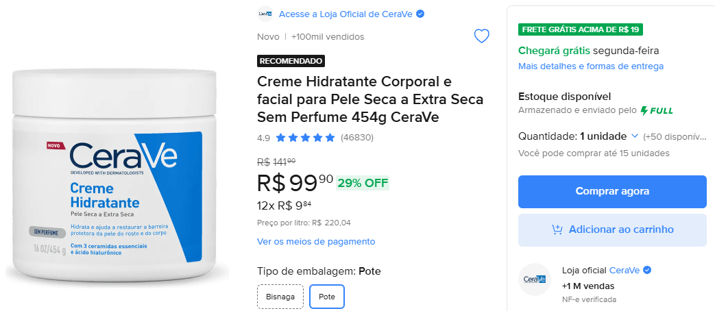 Creme Hidratante Corporal e facial para Pele Seca a Extra Seca Sem Perfume 454g CeraVe: de R$ 141 por R$ 99 (29% de desconto!) + frete grátis.