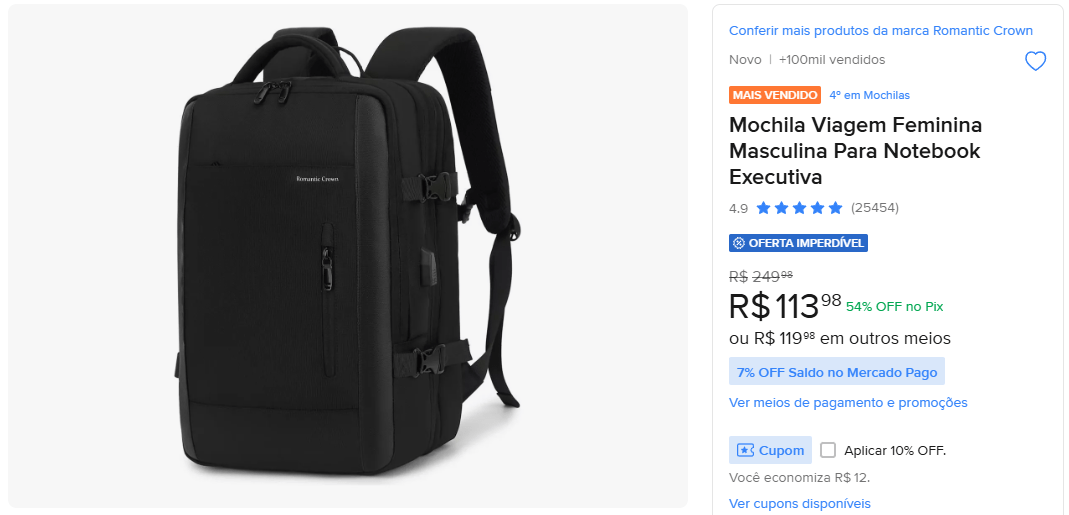 Mochila Viagem Feminina Masculina Para Notebook Executiva: de R$ 249 por R$ 113 (54% de desconto!) + frete grátis + cupom de 10% OFF (basta clicar em aplicar).