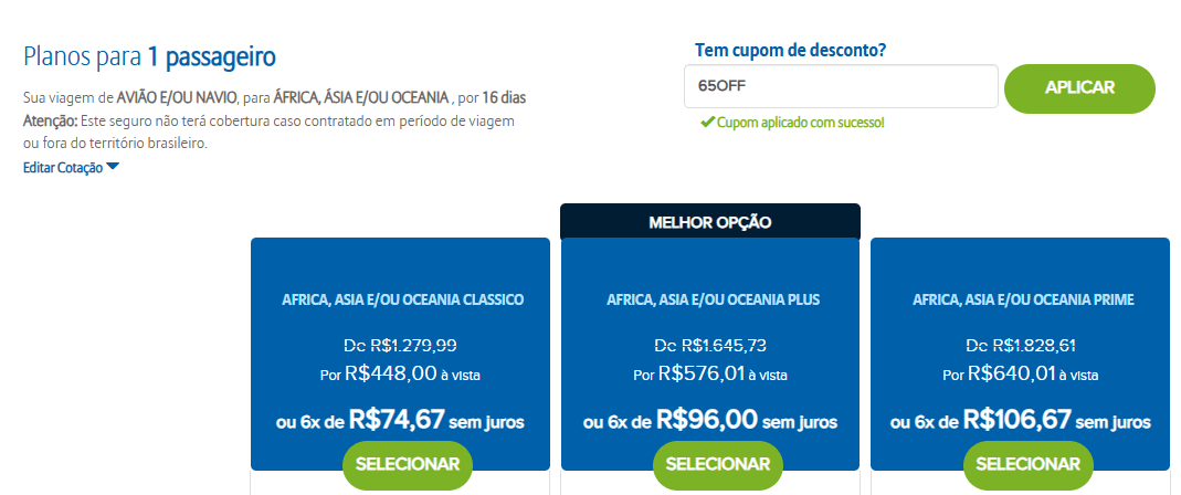 - “65OFF”: O viajante não precisará se preocupar em aplicar o cupom quando for finalizar a contratação do seguro. A aplicação é automática e feita pela própria Allianz.