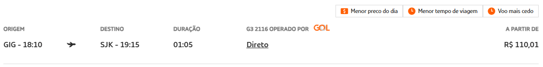 O menor valor encontrado foi no trecho Rio de Janeiro (GIG) → São José dos Campos (SJK), a partir de R$ 110,01.