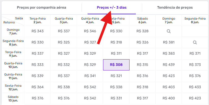Para visualizar essa função, basta acessar o site da Decolar, inserir origem, destino e período desejado e, na página de resultados, clicar em “Preços +/- 3 dias”.