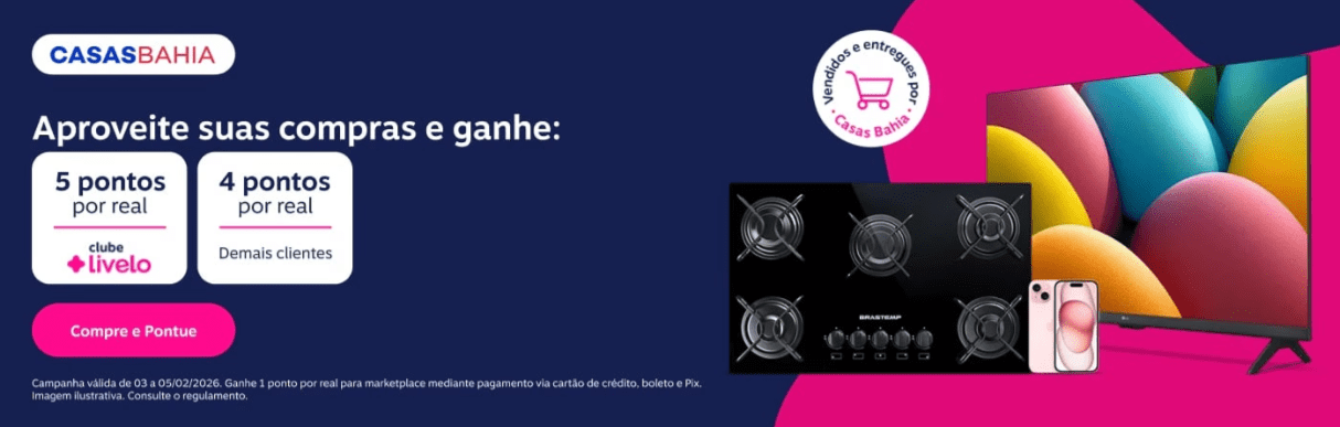 Casas Bahia: 5 pontos por real gasto exclusivo para assinantes Clube Livelo; 4 pontos por real para demais clientes em produtos vendidos e entregues por Casas Bahia e 1 ponto por real para marketplace mediante pagamento via cartão de crédito, boleto e Pix.
