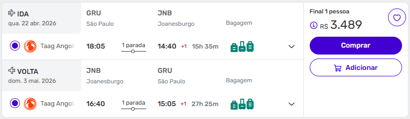Os voos são ida e volta com taxas inclusas e, neste caso, há opções com bagagem incluída e outras mais baratas sem despacho — ponto importante na hora de comparar.