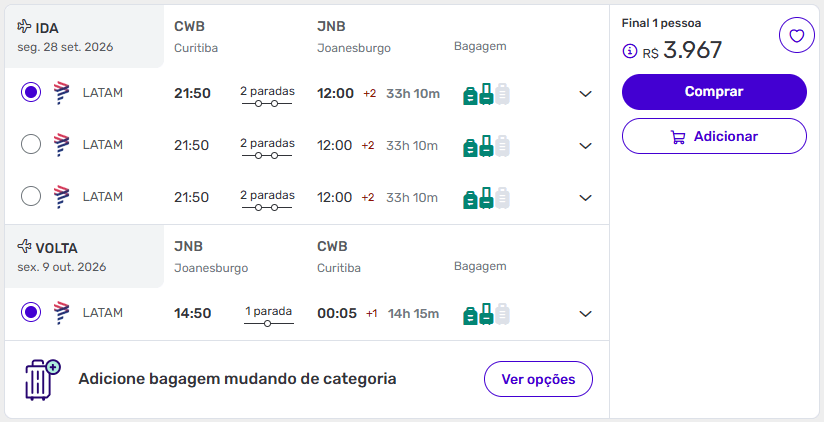 Para quem busca economizar de verdade, o voo saindo de São Paulo se destaca — especialmente por já incluir bagagem, o que evita custos extras depois.