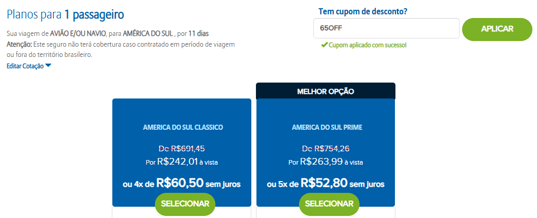 - “65OFF”: O viajante não precisará se preocupar em aplicar o cupom quando for finalizar a contratação do seguro. A aplicação é automática e feita pela própria Allianz.