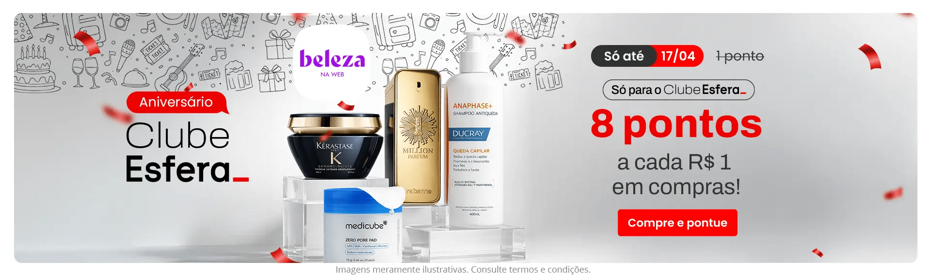 Beleza na Web: Clientes Clube Esfera: 8 pontos a cada R$ 1,00 em compras no site parceiro (1 ponto a cada R$ 1,00 para demais clientes).