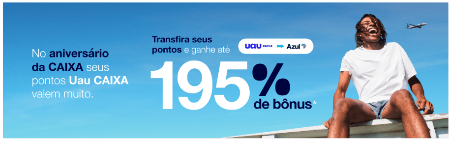 A CAIXA Econômica Federal está comemorando 165 anos e lançou uma campanha especial de aniversário que permite ganhar até 165% de bônus na transferência de pontos do programa Uau CAIXA para o Azul Fidelidade, programa de fidelidade da Azul.