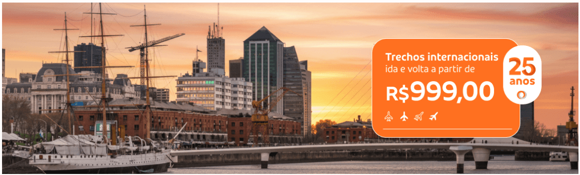 Além das ofertas domésticas, o Aniversário GOL 2026 – 25 anos também inclui destinos internacionais. A companhia divulga passagens internacionais de ida e volta a partir de R$ 999, em rotas selecionadas.