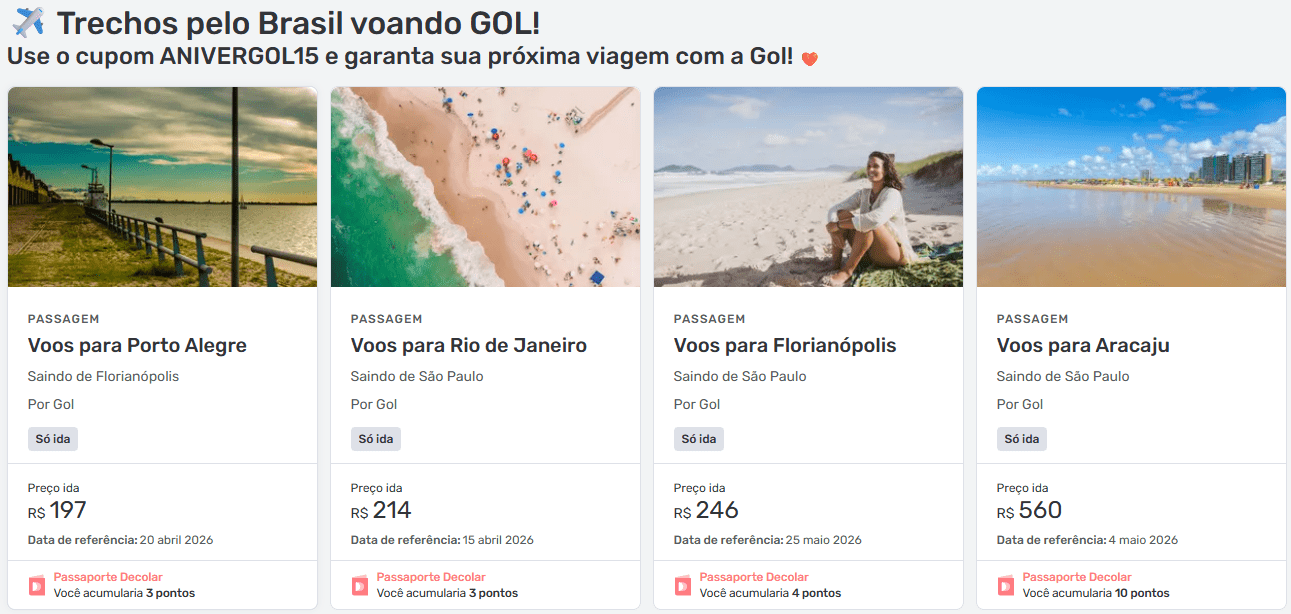 Para quem pretende viajar em 2026, o cupom do Aniversário da GOL na Decolar é uma boa oportunidade, principalmente em rotas nacionais populares, onde os preços já aparecem competitivos mesmo antes do desconto.
