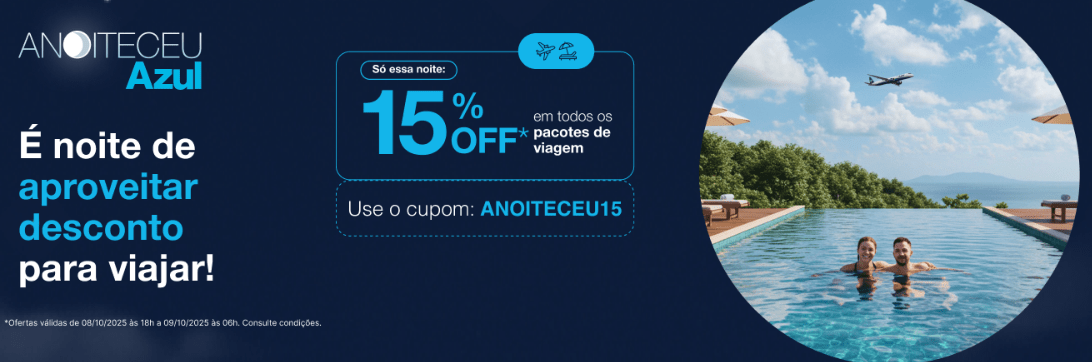Anoiteceu Azul! Promoção relâmpago traz cupom de 15% de desconto para todos os pacotes