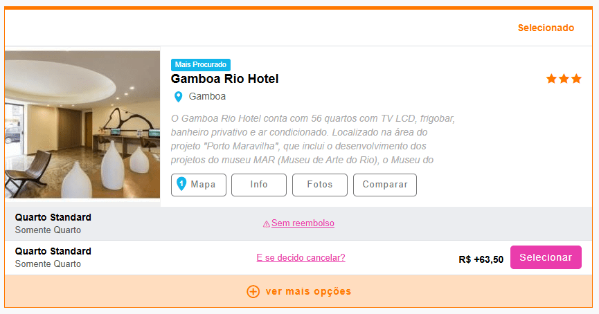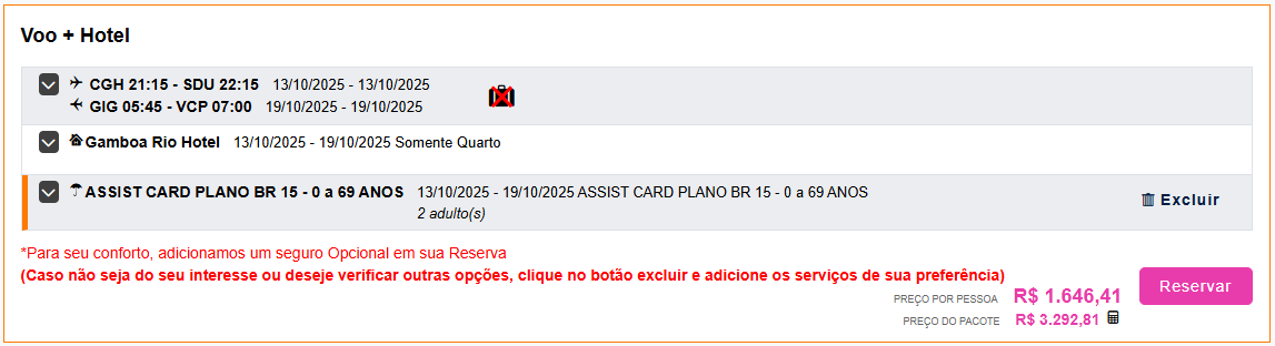 - Ao escolher um pacote que te interessa, clique para ver os detalhes: voos, hotel (quantos dias, categoria), taxas inclusas ou não, cancelamento etc.