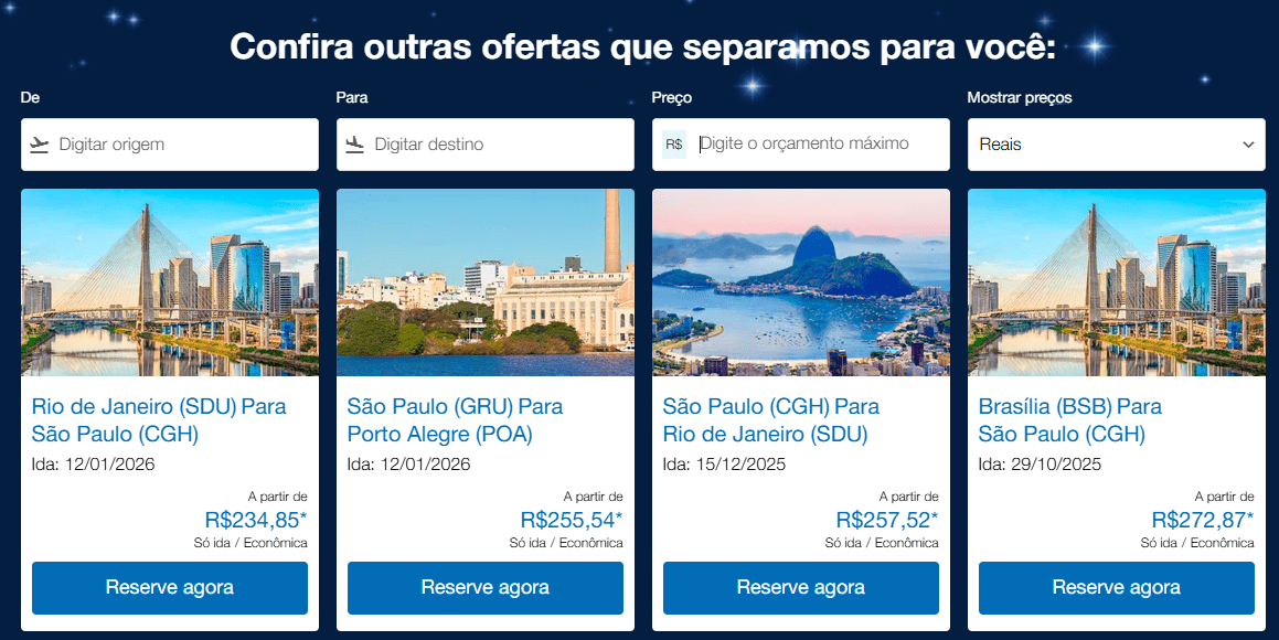 - Utilize a ferramenta disponível na página da promoção para facilitar a busca pelas melhores tarifas, conforme visto abaixo.
