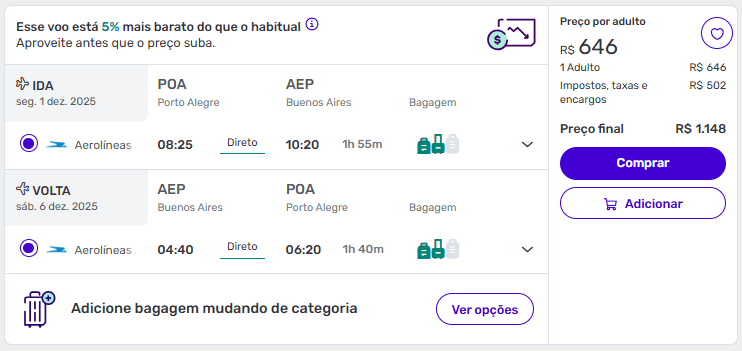 De Porto Alegre para Buenos Aires a partir de R$ 1.148 ida e volta.