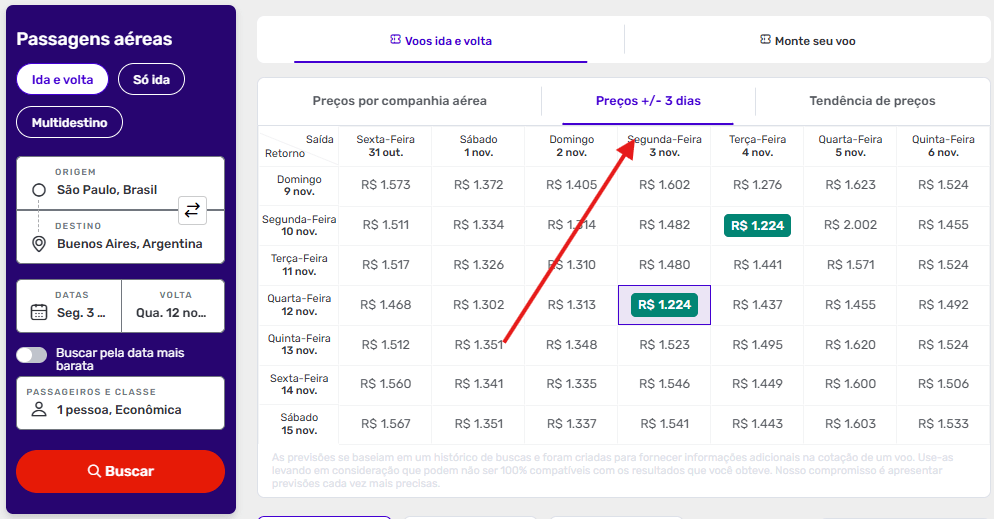 Faça sua busca e clique em “Preços +/- 3 dias” que um calendário com combinações de datas com as melhores ofertas irá se abrir.