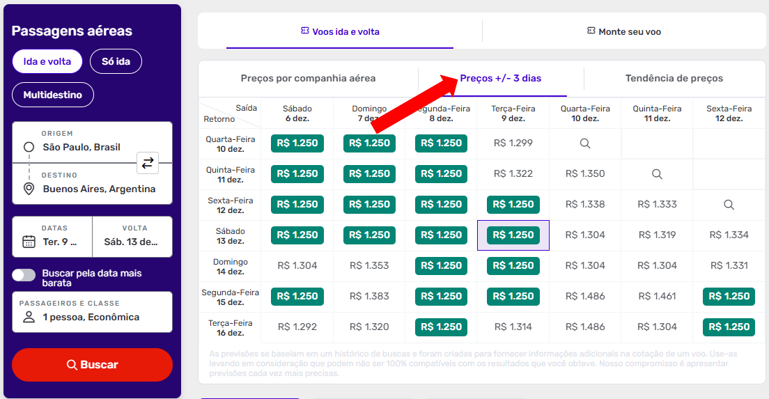 Faça sua busca e clique em “Preços +/- 3 dias” que um calendário com combinações de datas com as melhores ofertas irá se abrir.