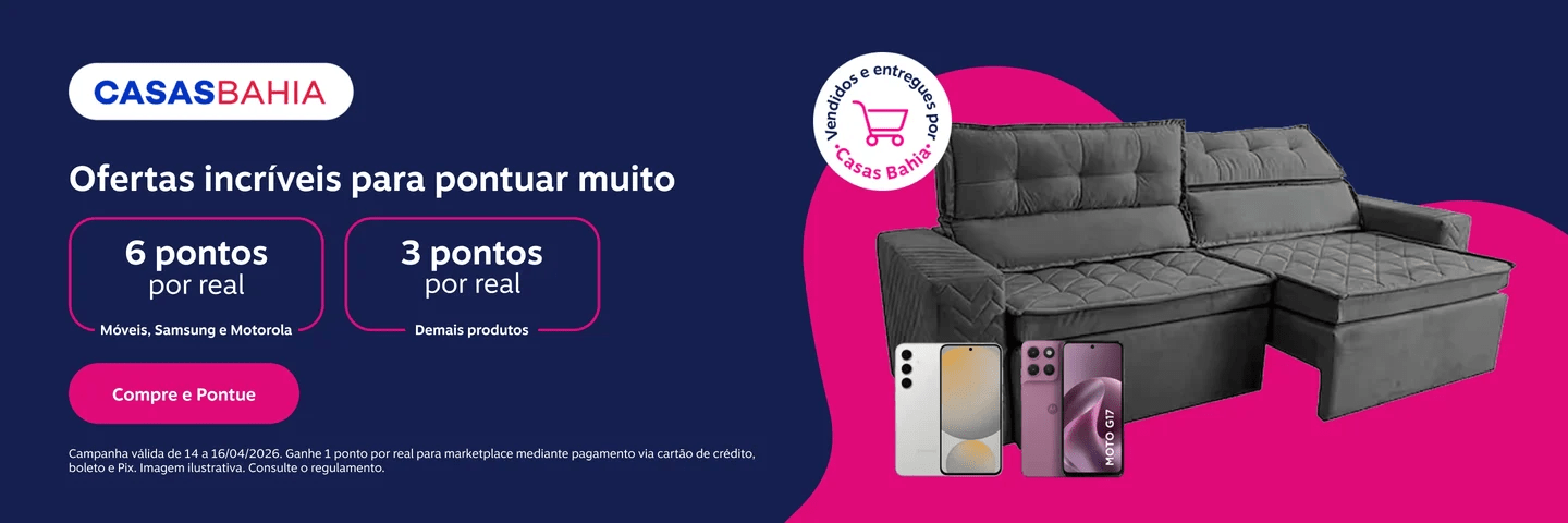 Casas Bahia: 6 pontos por real na categoria de móveis e em produtos selecionados da Samsung e Motorola; 4 pontos por real nos demais produtos vendidos e entregues por Casas Bahia e 1 ponto por real para marketplace mediante pagamento via cartão de crédito, boleto e Pix.