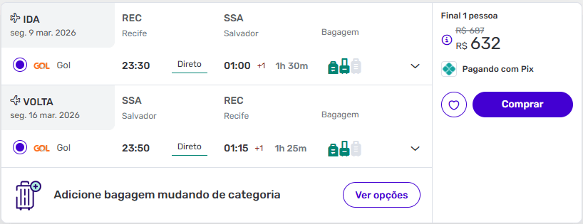 Passagens de Recife para Salvador a partir de R$ 632 ida e volta.