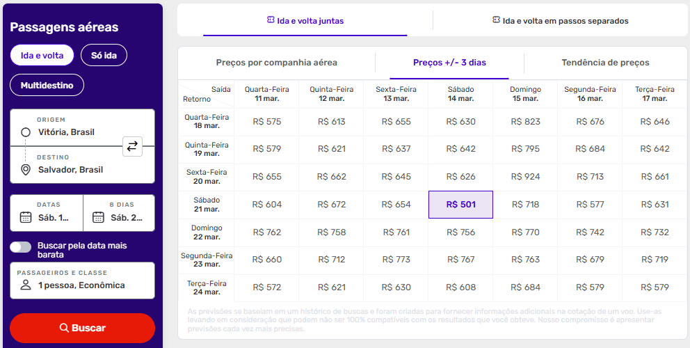 Faça sua busca e clique em “Preços +/- 3 dias” que um calendário com combinações de datas com as melhores ofertas irá se abrir.