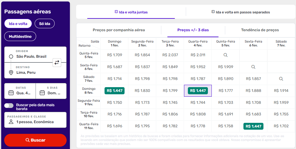 Acesse o site da Decolar e clique em “Preços +/- 3 dias”. Um calendário com as melhores combinações de datas e tarifas será exibido — ideal para quem tem flexibilidade de datas e quer economizar.
