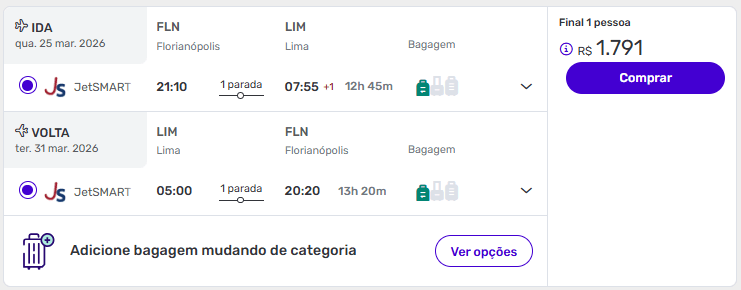 De Florianópolis para Lima a partir de R$ 1.791 ida e volta.