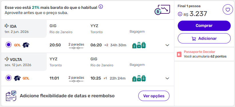 Essa é a melhor oferta encontrada, com 21% de desconto em relação ao preço habitual. Apesar do tempo de voo mais longo (com duas conexões), o valor compensa para quem prioriza economia.