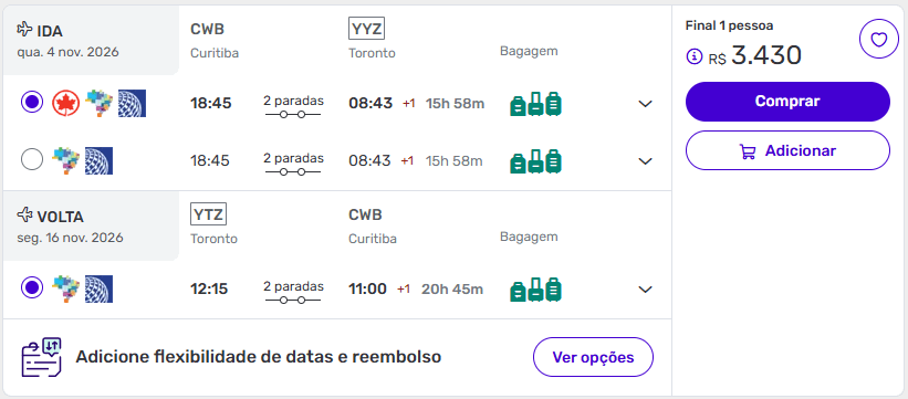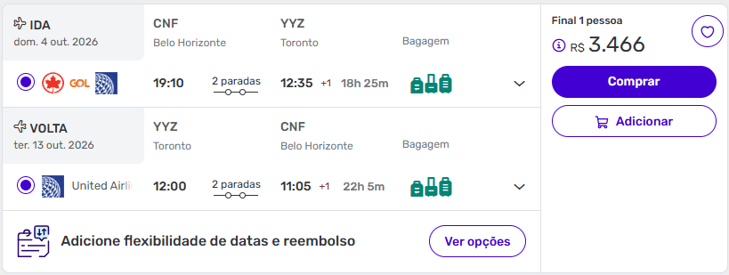 - Companhias: Air Canada + Gol Linhas Aéreas + United Airlines