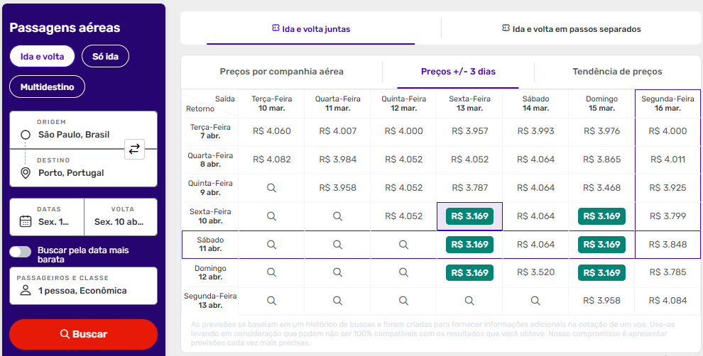 Faça sua busca e clique em “Preços +/- 3 dias” que um calendário com combinações de datas com as melhores ofertas irá se abrir.