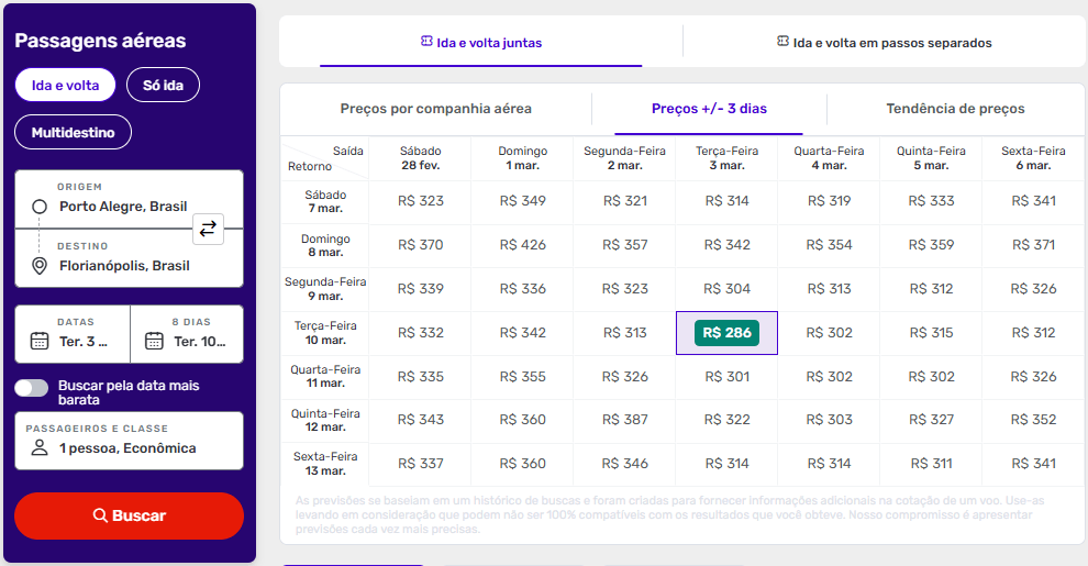 Faça sua busca e clique em “Preços +/- 3 dias” que um calendário com combinações de datas com as melhores ofertas irá se abrir.