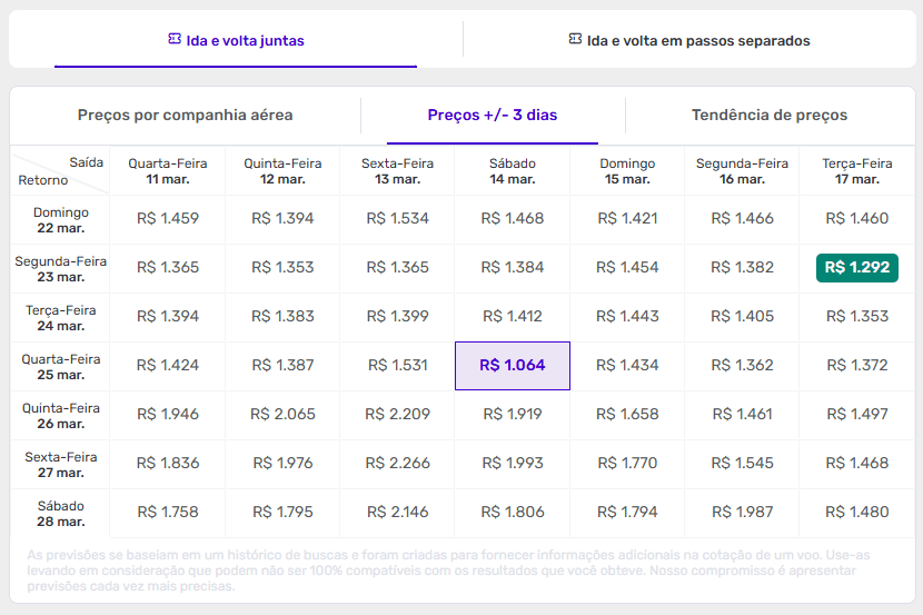 Acesse o site da Decolar e clique em “Preços +/- 3 dias”. Um calendário com as melhores combinações de datas e tarifas será exibido — ideal para quem tem flexibilidade de datas e quer economizar.