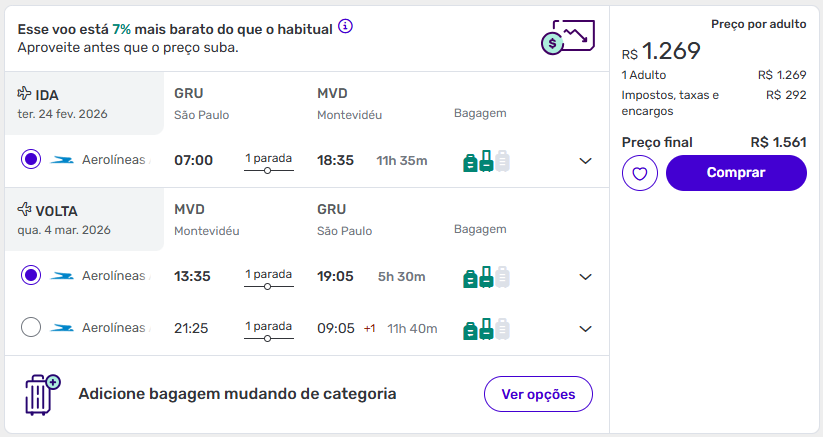 Neste momento, os meses de fevereiro, março e maio estão com as tarifas mais competitivas para embarcar rumo a Montevidéu.