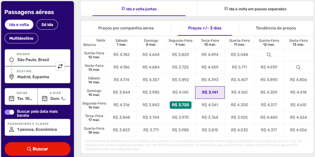 Faça sua busca e clique em “Preços +/- 3 dias” que um calendário com combinações de datas com as melhores ofertas irá se abrir.