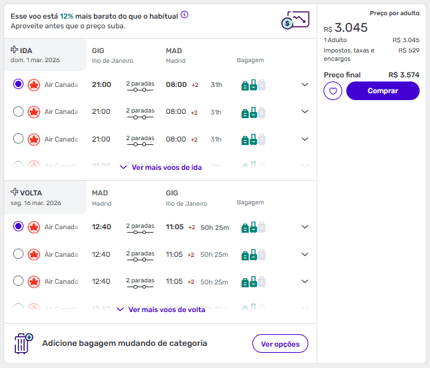 As passagens aéreas mais baratas que encontramos são de voos que partem de São Paulo, Recife, Fortaleza ou Rio de Janeiro, com opções de embarques em março de 2026.