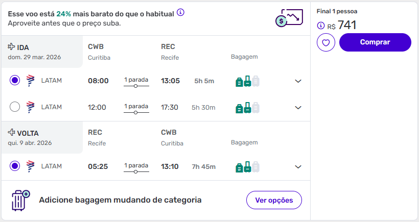 De Curitiba para Recife a partir de R$ 741 ida e volta.