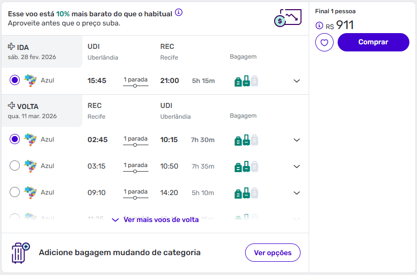 De Uberlândia para Recife a partir de R$ 911 ida e volta.