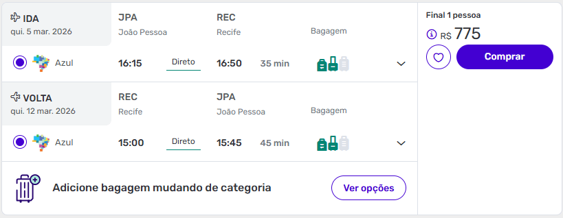 De João Pessoa para Recife a partir de R$ 775 ida e volta.