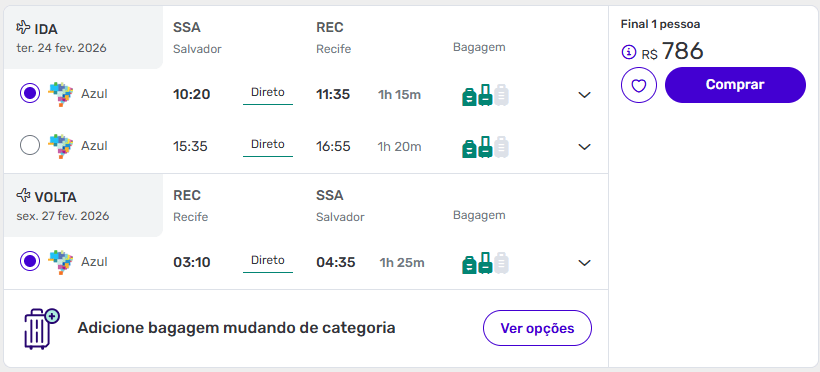 De Salvador para Recife a partir de R$ 786 ida e volta.