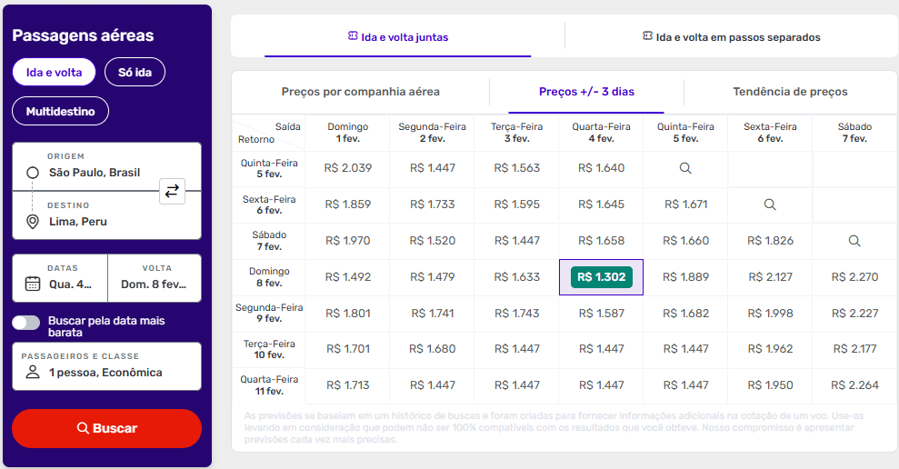Acesse o site da Decolar e clique em “Preços +/- 3 dias”. Um calendário com as melhores combinações de datas e tarifas será exibido — ideal para quem tem flexibilidade de datas e quer economizar.