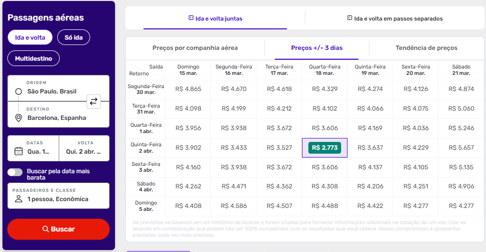 Faça sua busca e clique em “Preços +/- 3 dias” que um calendário com combinações de datas com as melhores ofertas irá se abrir.