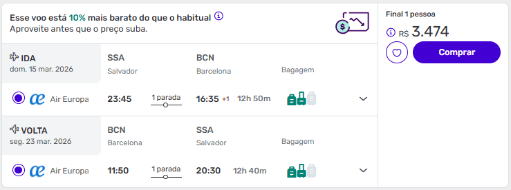 Passagens de ida e volta de Salvador para Barcelona a partir de R$ 3.474