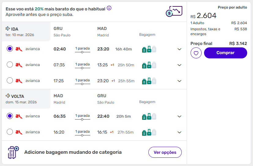 As passagens aéreas mais baratas que encontramos são de voos que partem de São Paulo, Recife, Fortaleza ou Rio de Janeiro, com opções de embarques em março de 2026.