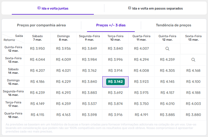 Faça sua busca e clique em “Preços +/- 3 dias” que um calendário com combinações de datas com as melhores ofertas irá se abrir.