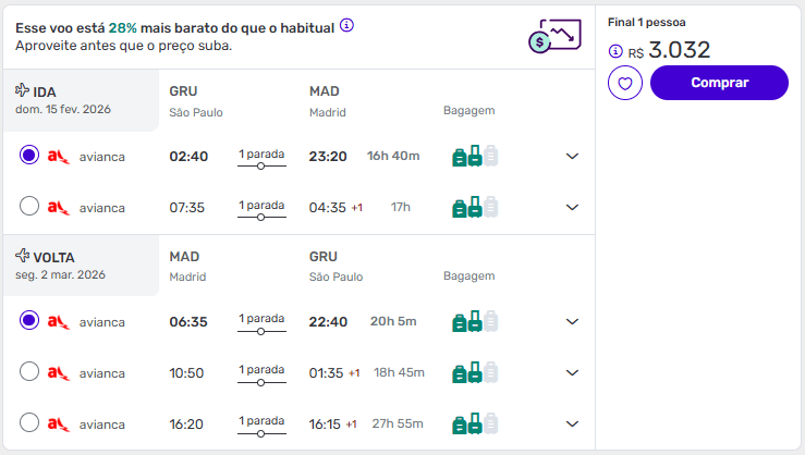 Encontramos nesta terça (4/11), ofertas de voos de ida e volta para Madrid a partir de R$ 3.032, com taxas inclusas.