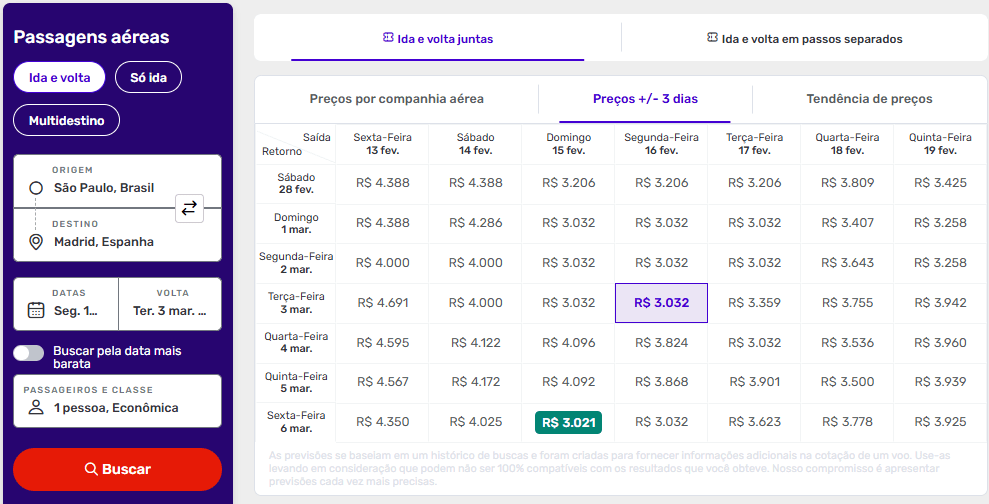 Faça sua busca e clique em “Preços +/- 3 dias” que um calendário com combinações de datas com as melhores ofertas irá se abrir.